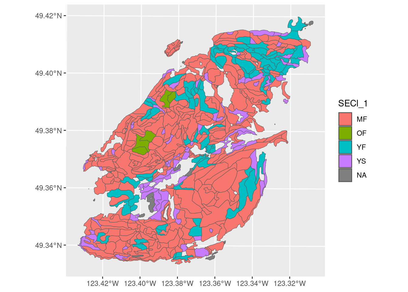 mvsei_secl_codes <-read.csv(here("data-raw/metrovancouver_sensitive_ecosystem_inventory/SEI_SECl_codes.csv"))mvsei_sesubcl_codes <-read.csv(here("data-raw/metrovancouver_sensitive_ecosystem_inventory/SEI_SEsubcl_codes.csv"))# Bowen Island SEI bowen_sei <- mvsei %>%st_intersection(st_as_sf(bowen.biodiversity.webapp::bowen_boundary))